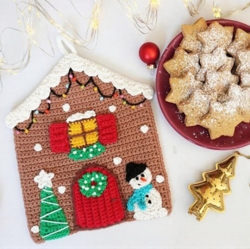 This fun Gingerbread House Potholder uses a 3.5 mm crochet hook, cotton yarn, stitch markers, tapestry needle, and other supplies. By Raffaella Tassoni.