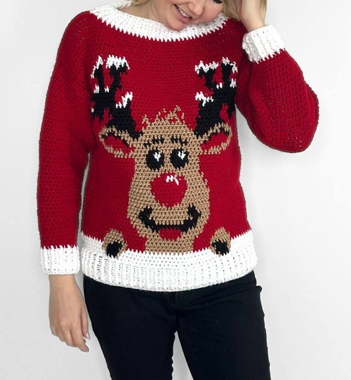 Wilma Westenberg Reindeer Christmas Sweater is available in XS-5XL sizes! Make it with hdc and color changes easily.