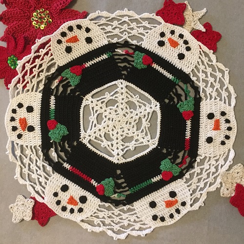 This doily is constructed using six dapper snowmen and other elements. View them in Marsha Glassner’s Ravelry free guide.