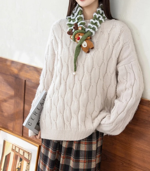 This scarf has a long, asymmetrical body and at the end is attached to a reindeer amigurumi, which functions as a hook in holding the other part. As shown! By Susan’s Family.