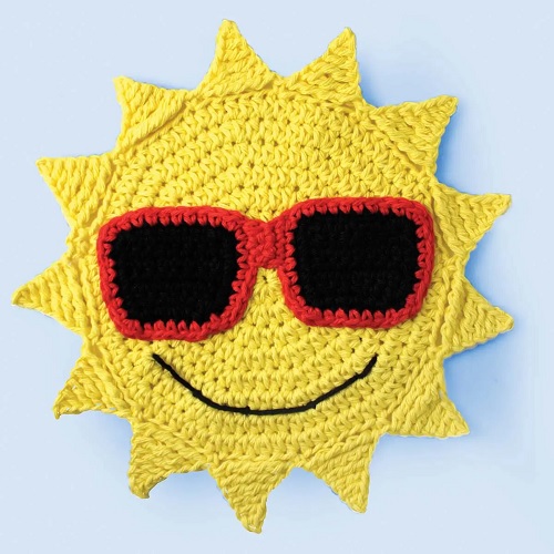 This sun with glasses is a perfect dishcloth for summer decor from Herrschners. It is 10 inches in size, stitched with a 4 mm crochet hook, three different colors of yarn (yellow, black, and red), and other materials. Super fun to make. View!