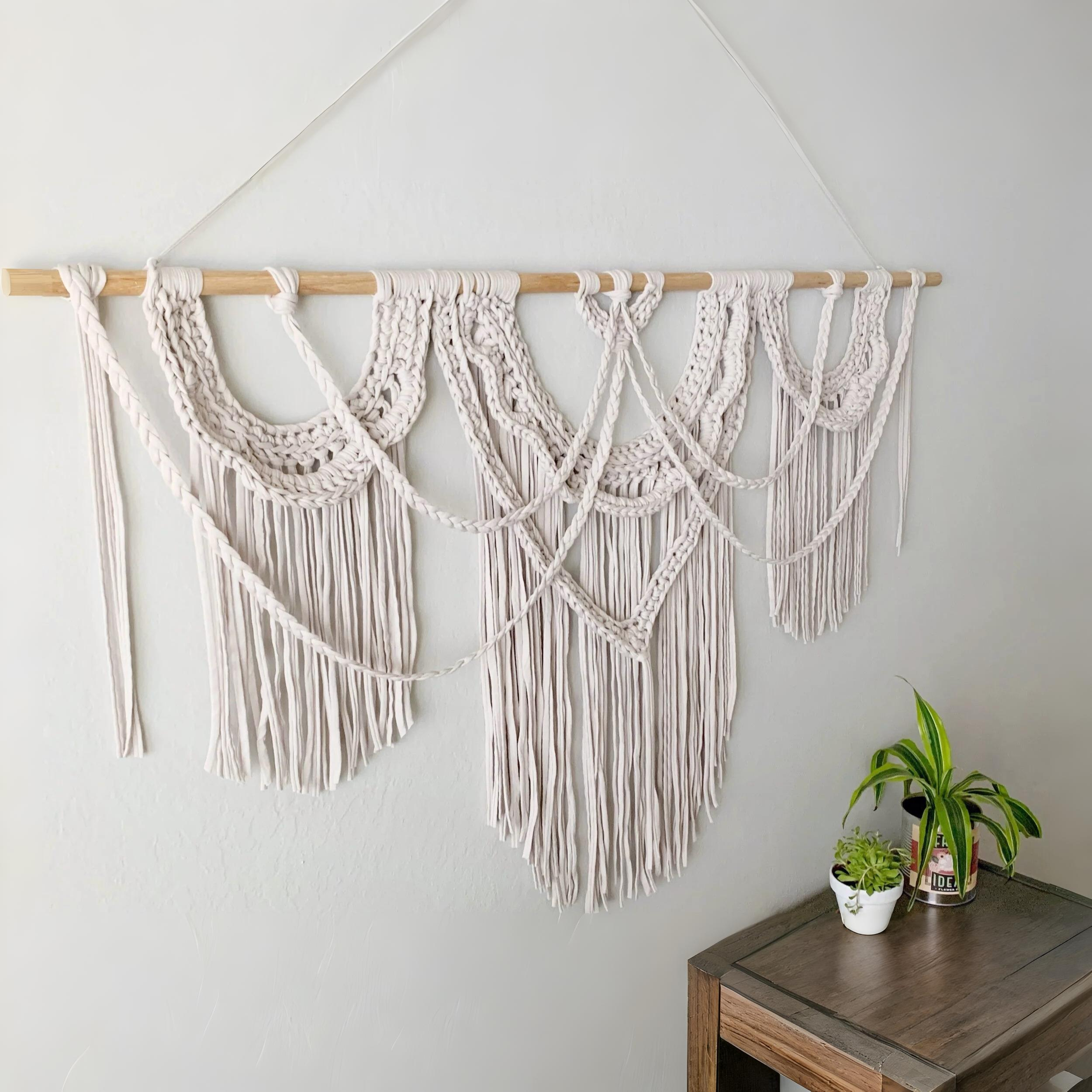 Want the look of macrame knots without actually knotting? Here is a way. Go through Meghan Ballmer’s Malvine wall hanging crocheting details – stitches, supplies, notes, gauge, and more.
