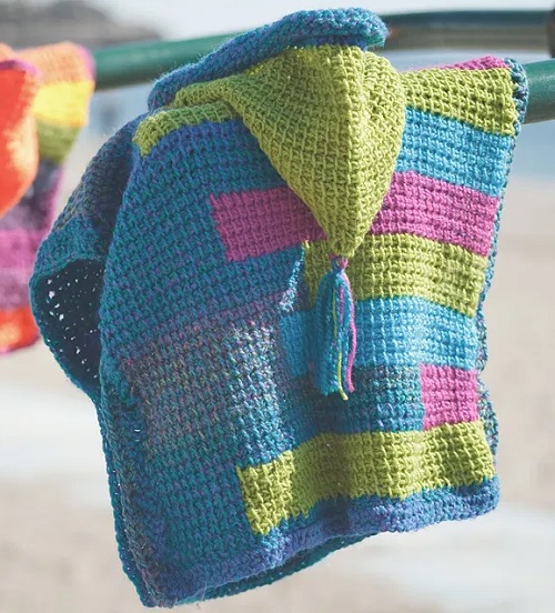 How about this hooded poncho jacket? Designed by Yarnspirations in a striped pattern using ch, dc, hdc, hdc3tog, sc, sl st, and other techniques.