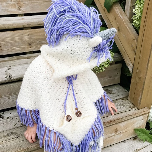 This simple poncho with pom pom works quickly, features a ribbed neck, hood, shell, fringed border, and other details. View! Shared by BabyCrochetDesigns.