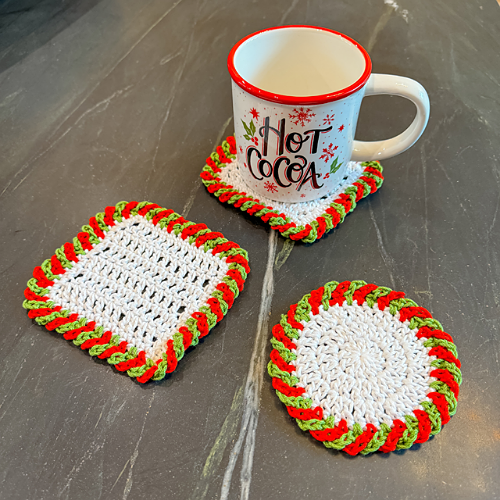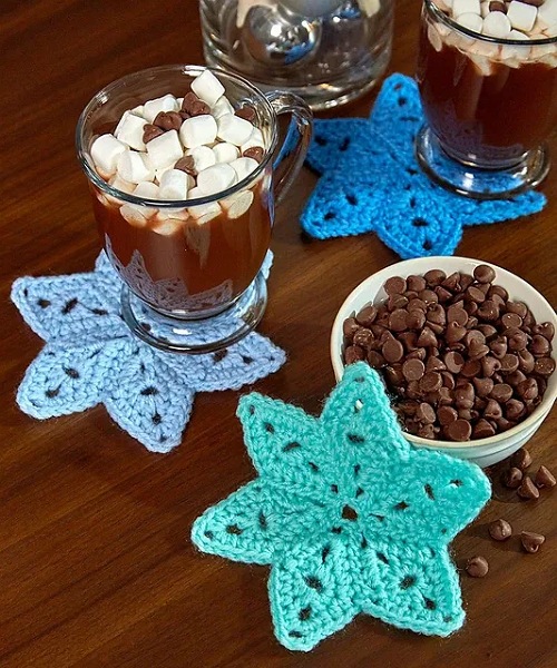The shown star-shaped coasters are 7″ in size – point to point. Yarnspirations crafter uses an easy method to crochet this quick winter project.