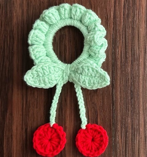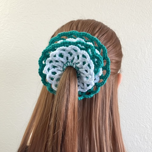 Hair scrunchies are indeed an iconic fashion piece! Vicky Handmade’s version uses two strands of yarn with a ribbon for adding a wreath-like design to it. View!
