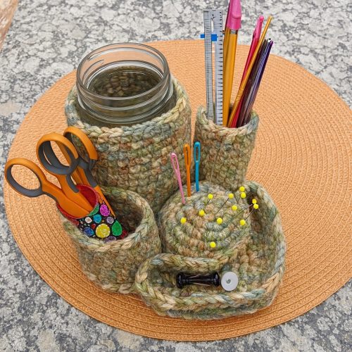 This one from Southern Gal’s Crochet has a mason jar to hold some eatables too, just like supplies for work, sometimes you may need for your body in order to work. HA! The finished size is approximately 4 inches tall and 8 inches wide. It is a sturdy project designed for your convenience.