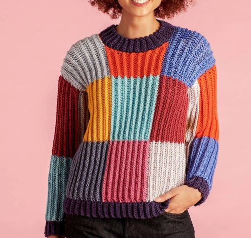 Yarnspirations crafter followed a color guide with contrast A, B, C, D, E, F, G, H, I, and J to make this Boxy Checks Sweater. Before you begin, just tally which thing has to be used where in which order, and all.