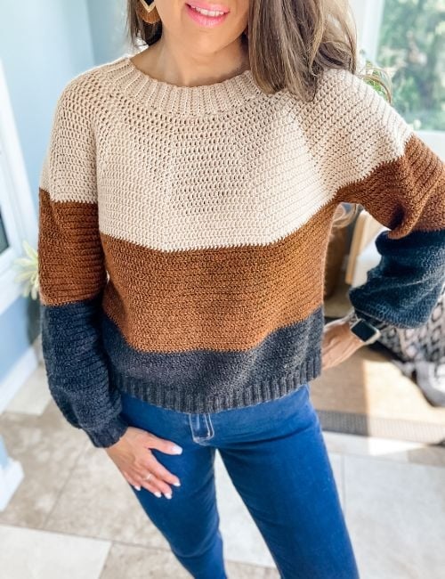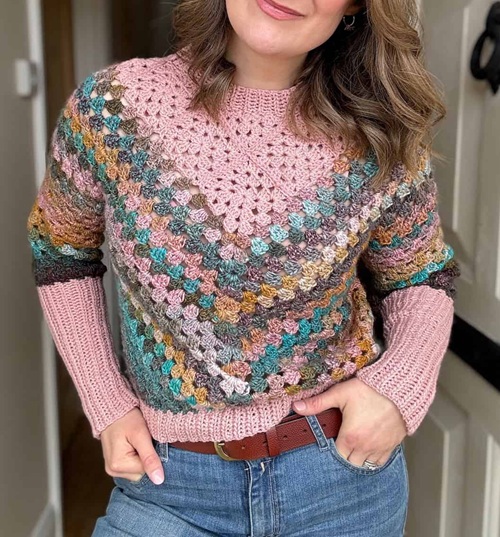 The Rocky Mountain Colourblock Sweater pattern requires you to gather a few supplies before you crochet it in rounds, one piece from top to bottom. Read from Michelle’s write-up what they are.