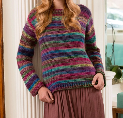 Diane Moye uses a 6 mm crochet hook and different colors of yarn balls, with a gauge of 15 dc + 12 rows, to stitch this Love to Wear Crewneck Sweater. Download the instructions.