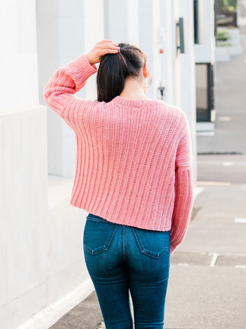 Create this oversized, ribbed, and cozy sweater using intricate stitches to form the shown knit-like structure. It has a ribbed texture, long sleeves, and a crop size. By Grace.