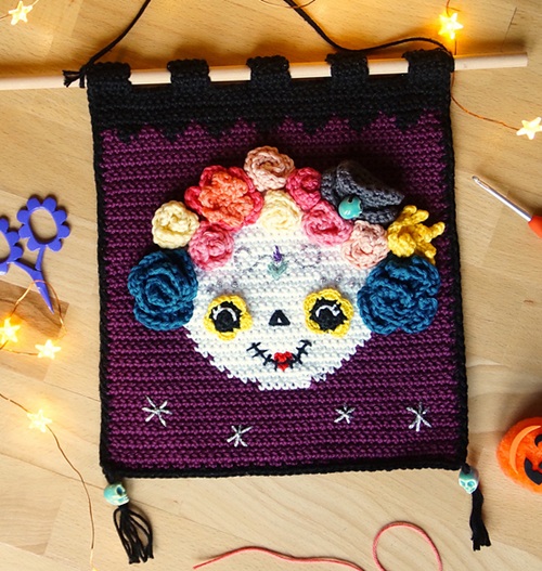 If you haven’t crocheted anything for Halloween decor, then you have the chance to make something for Day of the Dead. It’s a little face of Catrina formed in a wall hanging.