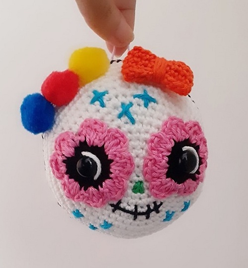 This one is a smiling skull ornament for your special day. Crochet it today using sc, inc, ch, hdc, dc, and other stitches using the Filesusr’s free guide.