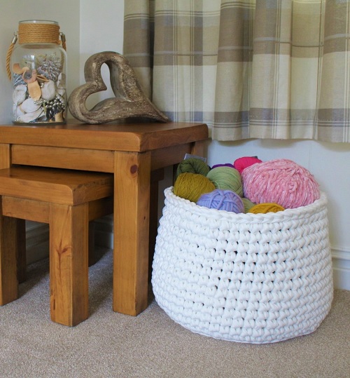 Clare M’s Chunky Floor Basket needs a12 mm crochet hook, off white t-shirt yarn, scissors, tapestry needle, and tape marker to get crocheted. View!