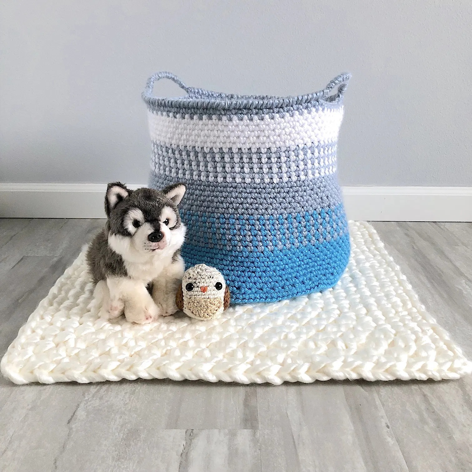 This super large Blue Coast Basket is a classic design, created with nautical colors. Jade crocheted it for storage and organizational purposes in any space.