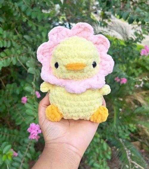 A project that combines adorable chickens with flowers is here by Ami Saigon. She uses basic stitches like ch, sc, dc, sl st, and more. Check.