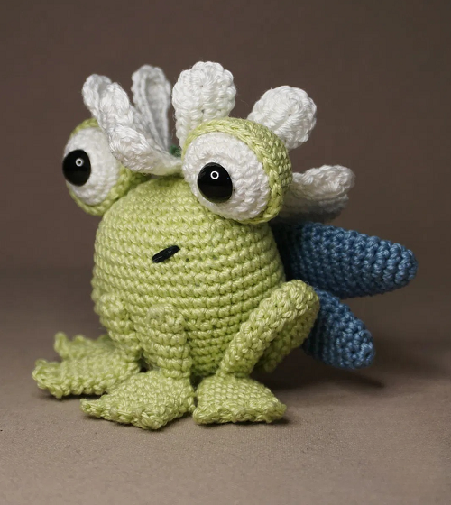 Acanthus made this Freddie, a fun-loving fairy frog. Features wings, a daisy hat, and more. All worked with fine cotton yarn, crochet hook, and other supplies.