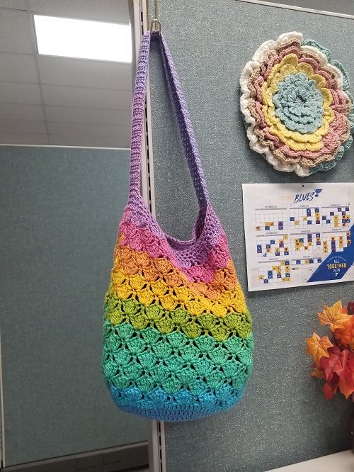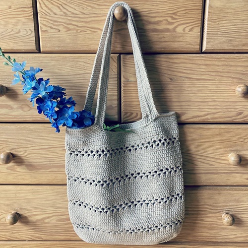 Meri Meri’s grocery bag is a combination of st, sc, dc, and tr. The pattern is mermaid-inspired. Really!