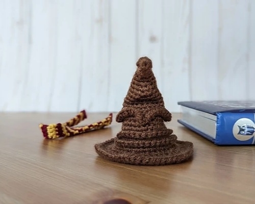 Sorting hat from the famous series – you know which one! It is 3 inches in size, constructed with basic beginner methods using a 2.75 mm crochet hook. By Ankita Palit.