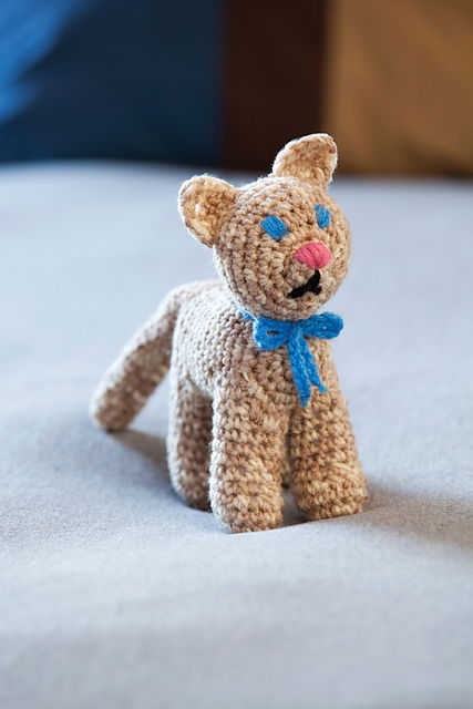 Worsted weight yarn, a 3 mm hook, stuffing, plastic pellets, embroidery floss, and 6 mm safety eyes. This is all you will need to stitch Nimoe’s Blog’s absolutely adorable 3 inch tall amigurumi. It will make a fun toy for your pets, too!