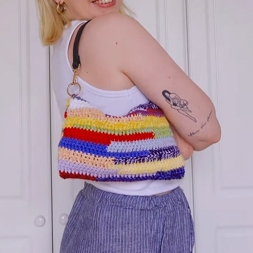 For this crochet patchwork bag from yarn leftovers, add a 4.5 mm hook, cotton chain yarn, and other supplies to your working desk before you start stitching this colorful Miu Miu bag. By Lolo Rose crochet.