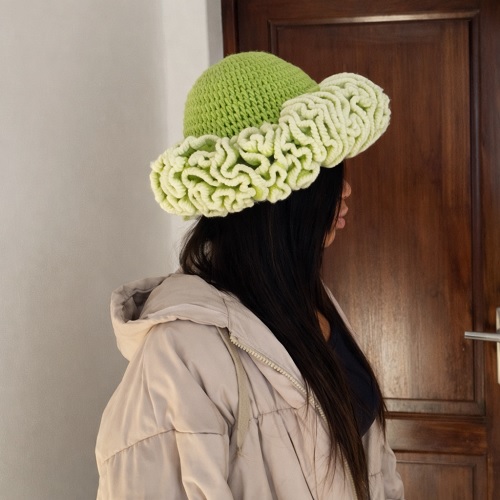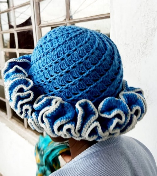 Another pretty ruffle hat! This one is by Hira. It is both unique and stylish, perfect for wear at any casual outing. Stitch now!