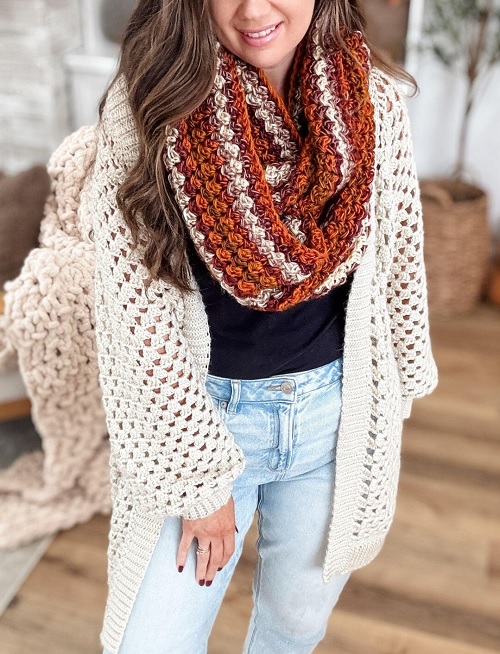 What about this gorgeous addition? It uses only two stitches – double crochet and mesh. Easy to crochet. It can be prepared in only two days. Plus its long enough to get multiple rolls around the neck. By Kik and Jack Crochet.