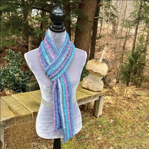 Rachel’s Aurora Scarf features a chunky pattern crocheted with a contrasting combination of yarns. Works up in under 2 hours and is warm enough to keep you cozy and stylish outside in the snow as well.