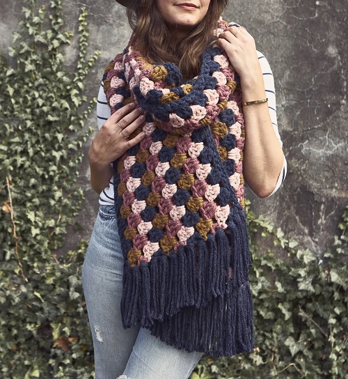 Made with Double Stitch and Twins Circle Loops, this scarf can really enhance your fashion game. Making the designer skeptical about it beginnner friendly construction. Yes. Download the PDF from Yarnspirations to know.
