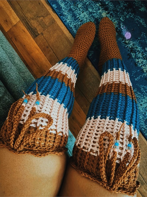 How about FluffyKnots By Ijay’s thigh-high socs? Each piece features a heel, a shell design on the end, and other details that extend from the toes to the top. View.