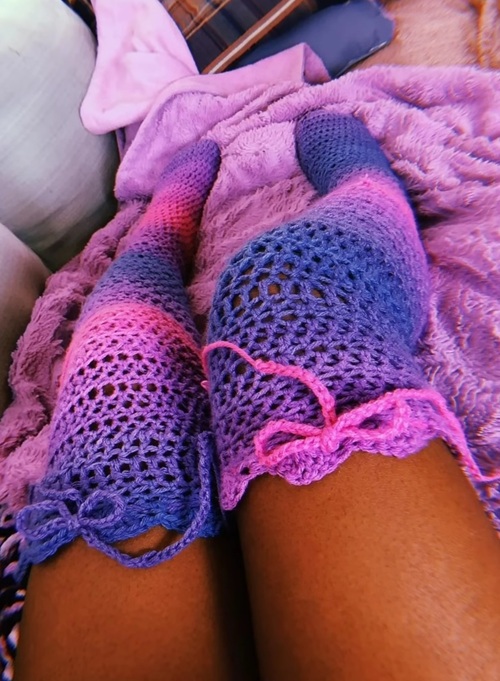 Use the gauge of 6sc x7 rows with sl st, ch, sc, dc, st, sts, and work in rounds to stitch the above overknee socks. Shared by Swecraftcorner.