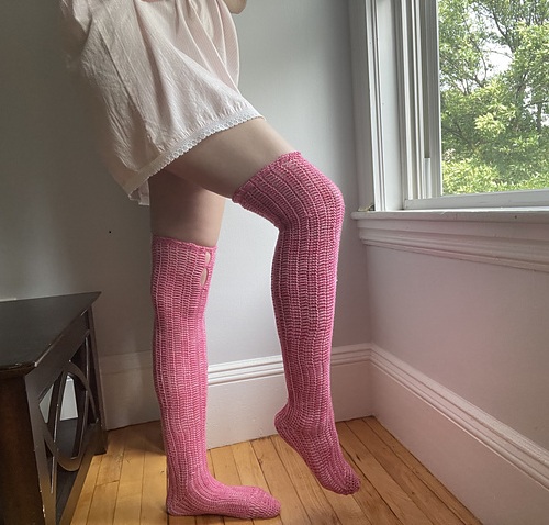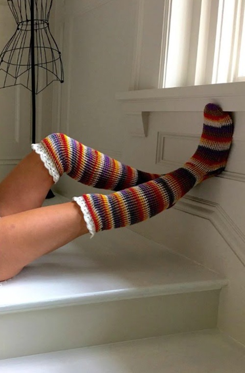 Sarah Rivera’s thigh-high socks pattern is available in different sizes with the instructions to design. Download the free PDF from Ravelry.