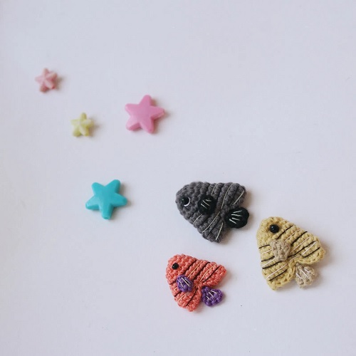 These tiniest fishes by Amanda Ray are crocheted using a 3.5mm and 1.5mm crochet hook. Use them as a zip puller, bag charms, and decor items!
