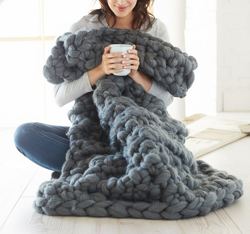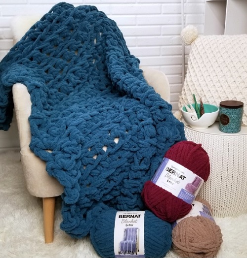 Waiting for an easy to do, hookless crochet pattern? Here it is from Deliacreates. The blanket has a purl-like look and uses only three materials (yarn, scissors, and fingers).