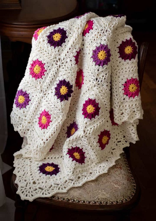 The “Blooming spring” blanket adds a burst of nature to your resting hours. You can have it simply working with solid granny squares in floret stitch.