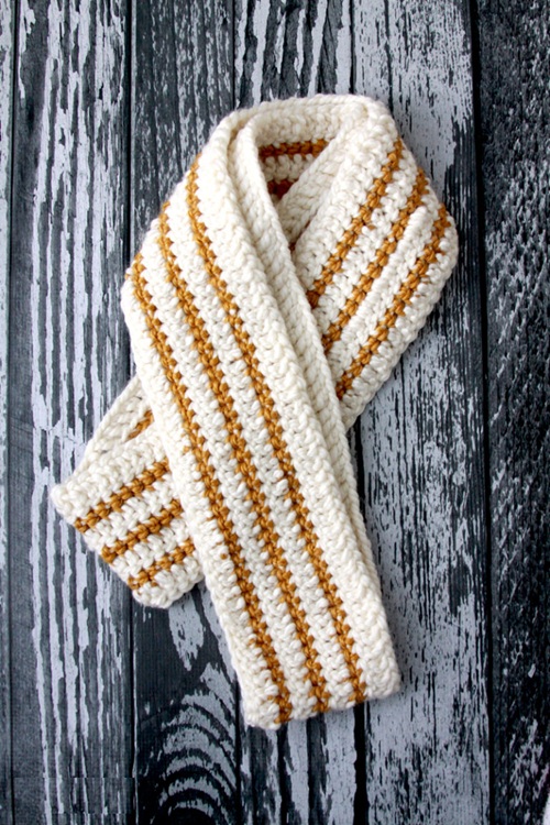 Add this striped scarf in your collection that can be crocheted with cream and gold yarns. Here, single and double crochet patterns are used, but the rows are worked in the back loops for giving the brims a ridged look.