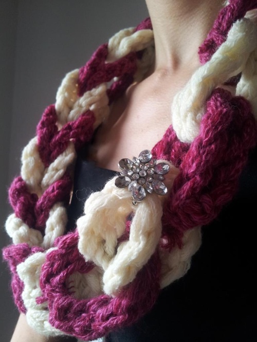 This scarf tops the list as its contrast combo yarns, forming a bracelet-like pattern, give off a tailored look. Here, the blogger has utilized Sirdar denim super chunky wool of dark pink and cream shades.