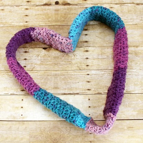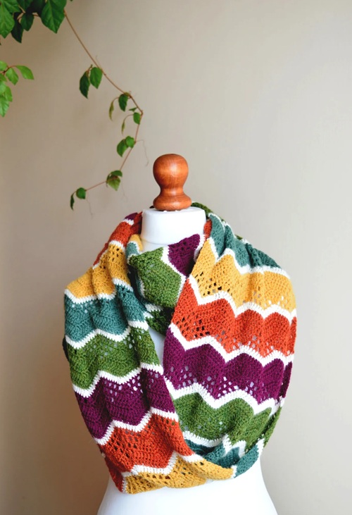 The fusion of Ochra, Rust, Plum, Lemongrass and Forest Green hues on this scarf are fabulous! Surely one of the most colorful free crochet infinity scarf patterns to try. Check out the steps on My Crochetory.