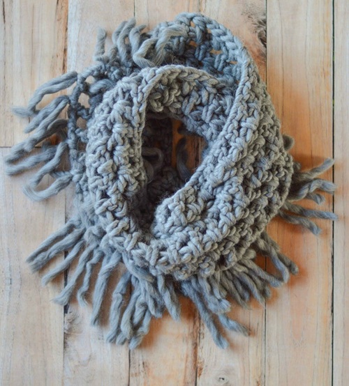 This chunky infinity scarf with a row of fringes at the bottom will offer instant gratification while covering your neck. For crocheting this, select 2-balls of bold colored bulky weight yarn and let the crochet hook play its magic.