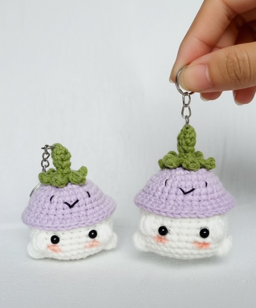 Learn how to make this Eggplant Mushroom keychain with a step-by-step tutorial from Hanabi Amigurumi. It involves just 4-5 stitches.