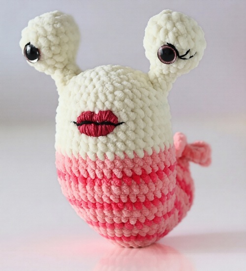 This crochet monster with shiny eyes and big lips is designed by Zsuzsa. It uses yarn, fiber filling, tapestry needle, safety eyes, and many more.