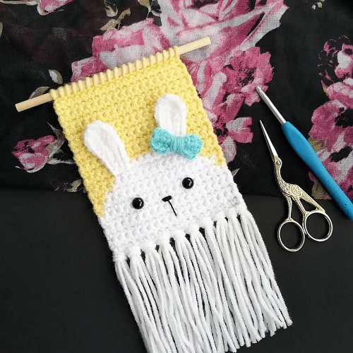 This sweet, bunny wall hanging with fringes and a bow uses the intarsia crochet method and two base colours. Fay has included some charts for better illustration as well.