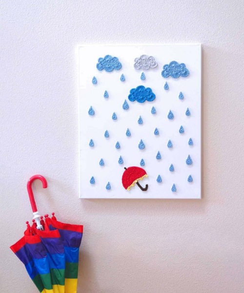 A perfect crochet home decor project for rain lovers. It featured crocheted clouds, umbrellas, and raindrop motifs glued onto the canvas. Olena shared the pattern for each. You can decorate your boring walls with it.