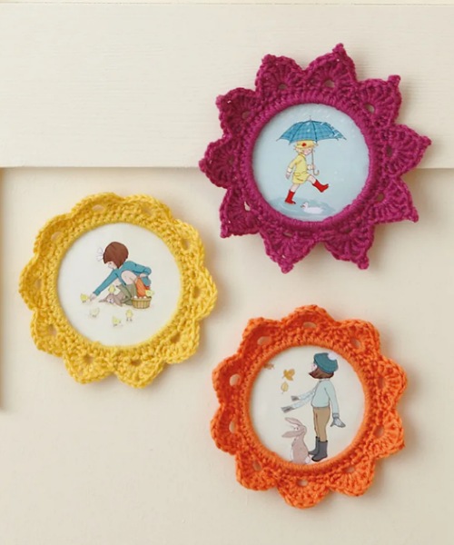 Try this crochet picture frame with Matt Spiers. It uses 4 ply yarn and a 3.5 mm crochet hook. You can download the PDF pattern to know the crocheting details.