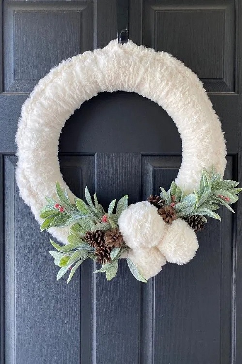 A few skeins of yarn, a crochet hook, a foam wreath, a floral embellishment, a glue gun, scissors, a yarn needle, and a few more supplies – gather all. Pam’s free details are already ready to try hands-on.