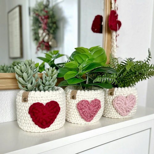 This crochet cover with a heart motif is what you need to cover up your messy pots worked with blo, ch, hdc, rsc, sl st, sts, and wc. Created by Erin. You can make it big or small by adding or removing the chains.