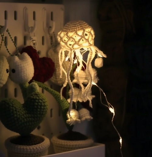 Learn to crochet a Jellyfish Lamp Light to make your area cuter and cozier from Poong Tran. It uses only ch, sc, dc, and sl stitches.