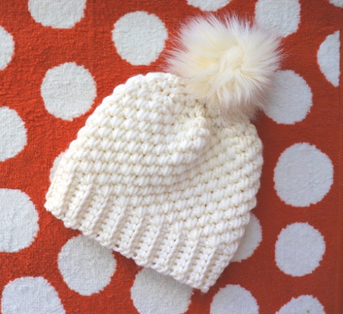 Crochet this beanie quickly using gauge 8 sts x 7 rows hdc in the third loop. It has a slouchy fit with a textured surface and a lovely pompom at the top.
