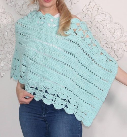 Confident beginners, join in. Luisa Clare’s poncho is for you and all other level crocheters as well. It has a two way styling pattern. For a polished look, wear it on the shoulder so its peacock-stitch border is highlighted.