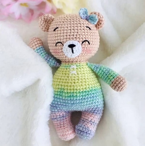Eryhana’s Candy Sleepy Bear uses sc, inc, dec, ch, and dc crochet stitches. You can try the same with some different color combinations, too.